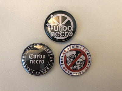 Turbonecro logo button, Bingo Carlos Harry Vegard button, and No Denim No Glam No Sailor No Fun button. Diameter: 2.5 cm. Made by the nice people at Nordpolen Industrier AS.